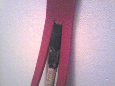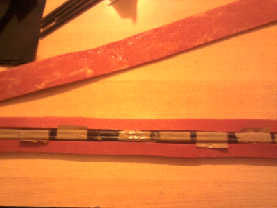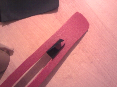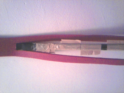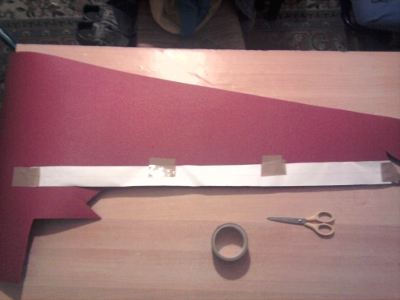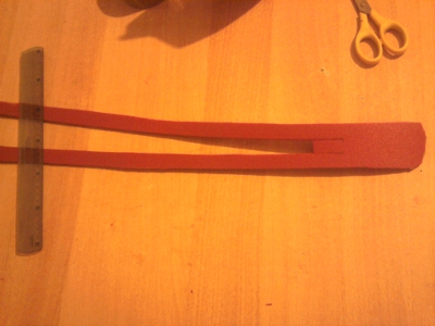 Take one of the 3 shapes and cut a tape in the middle of it. The width of it is the size of the two rods. Here it is 16mm = 2x8mm. At this place will come the rods. So it has to be cut from the cross-guard to few centimeters before the end of the blade. Few centimeters free of the rods are required to avoid to hurt another player or dammage the blade.